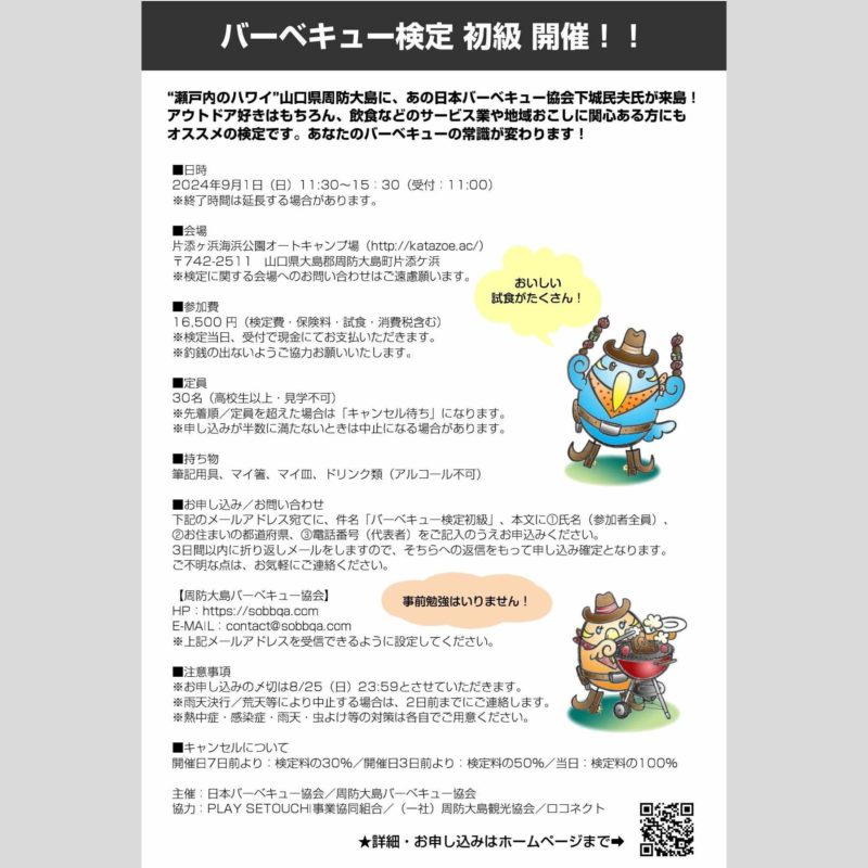 9/1(日)“瀬戸内のハワイ”山口県周防大島にて初級バーベキュー検定を開催!